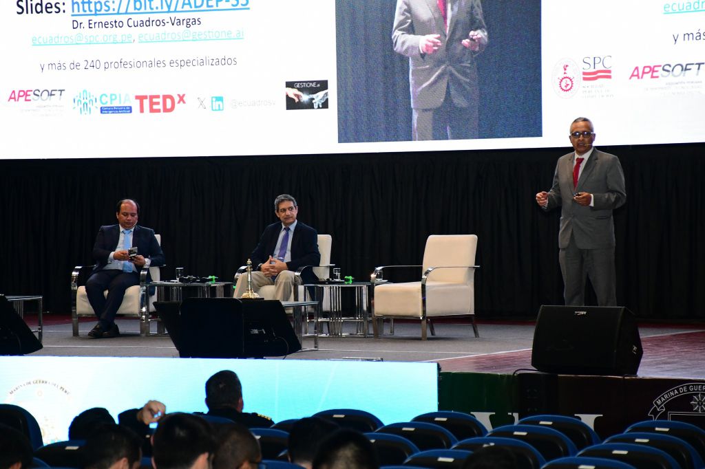 Por la tarde del 17 de septiembre, se desarrollaron los paneles enfocados en ciberseguridad e inteligencia artificial. En el Panel 3.A, Ciberseguridad y Ciberdefensa, el Ing. Juan Carlos Espinoza Revilla, CEO de Unity Perú SAC, presentó “La cuarta fuerza: la ciberdefensa y sus fronteras digitales”. Lo siguió el Dr. Ernesto Cuadros-Vargas, fundador de la Sociedad de Computación Peruana, con el tema “Arquitectura digital para el desarrollo del Perú”. Finalmente, el Contralmirante (r) Enrique Arnáez Braschi, Vicepresidente Ejecutivo de Kriptome Cybersecurity, expuso “Ciberdefensa en operaciones militares: capacidad estratégica en la guerra moderna”.